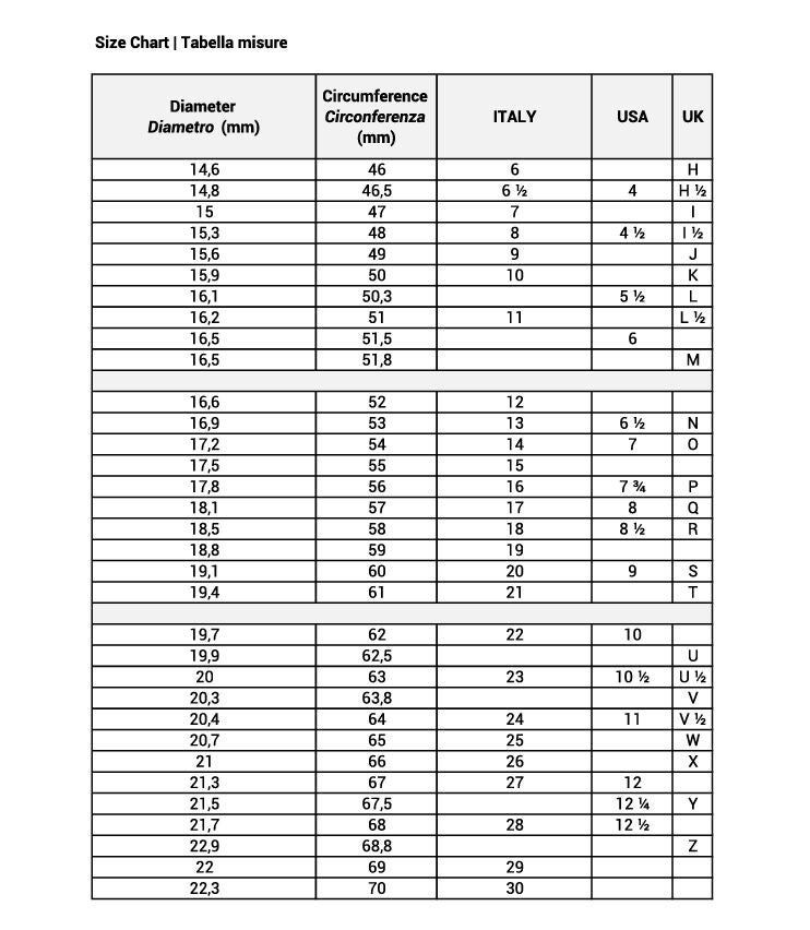 Avvolgi una striscia sottile di carta o un metro morbido attorno alla base del dito. Segna il punto di chiusura e misura la lunghezza in millimetri. La misura ottenuta corrisponde alla circonferenza del dito ed equivale alla taglia EU più vicina.