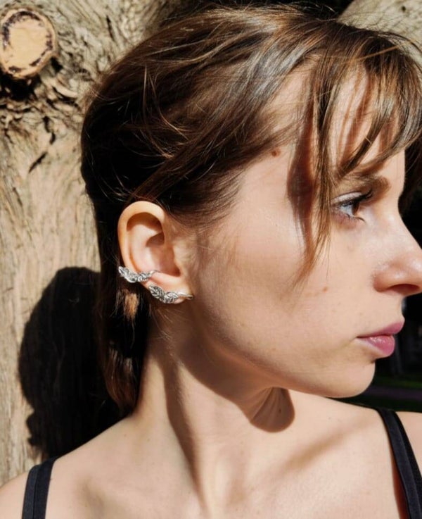 Le foglie si intrecciano attorno all’orecchio in un gesto organico, come se crescessero naturalmente sulla pelle.